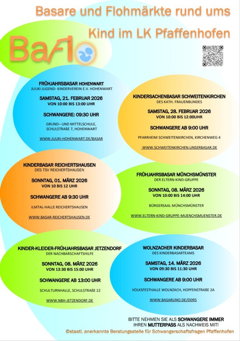 Wer noch einen Basar oder Flohmarkt melden will, kann sich gerne mit der Schwangerenberatung in Verbindung setzen. Einfach die Veranstaltungsdaten per E-Mail an gesundheitsamt-praevention@landratsamt-paf.de senden.